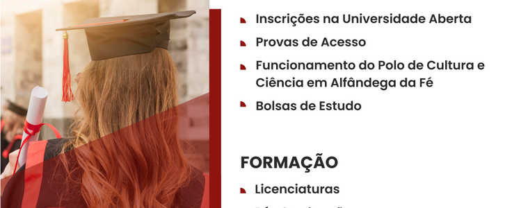 Abertura do procedimento de consulta pública para o Regulamento para de Atribuição de Bolsas de Estudo para Estudantes da Universidade Aberta – Polo Cultura e Ciência e de Alfândega da Fé. Saiba mais aqui.