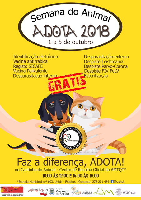 A Associação de Municípios da Terra Quente Transmontana, assinala a Semana do Animal “Adota 2018”, de 1 a 5 de outubro, no âmbito do Dia Mundial do Animal que se celebra anualmente a 4 de outubro. O objetivo é sensibilizar a população para a importância dos direitos e bem-estar dos animais de companhia.