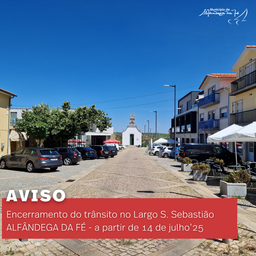 De acordo com estipulado em Comissão Municipal de Trânsito, informa-se que a partir das 8 horas do dia 14 de Julho de 2025, o trânsito no Largo S. Sebastião, em Alfândega da Fé, estará encerrado, execeptuando-se as situações de cargas e descargas.