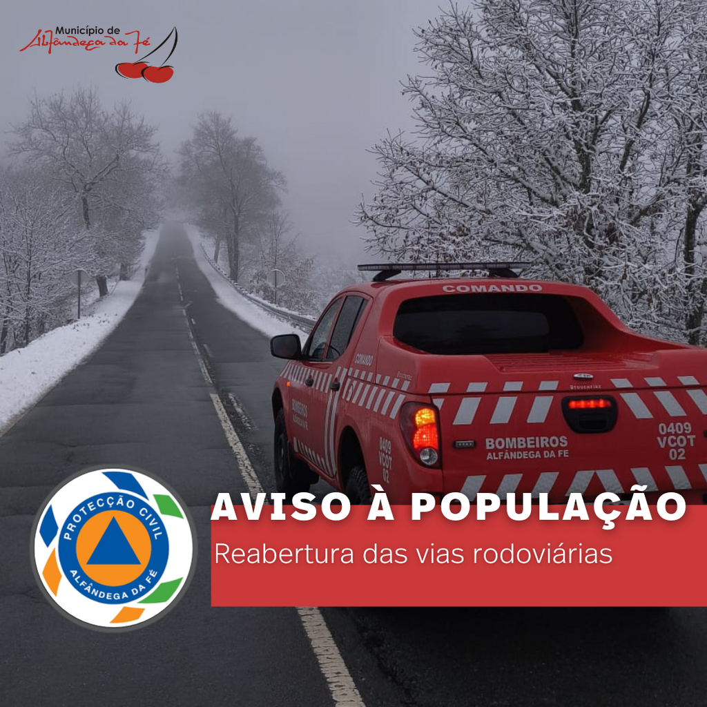 Informa-se toda a população que, as vias anteriormente encerradas no concelho de Alfândega da Fé já se encontram transitáveis. Recomenda-se especial prudência e precauções redobradas na circulação rodoviária.