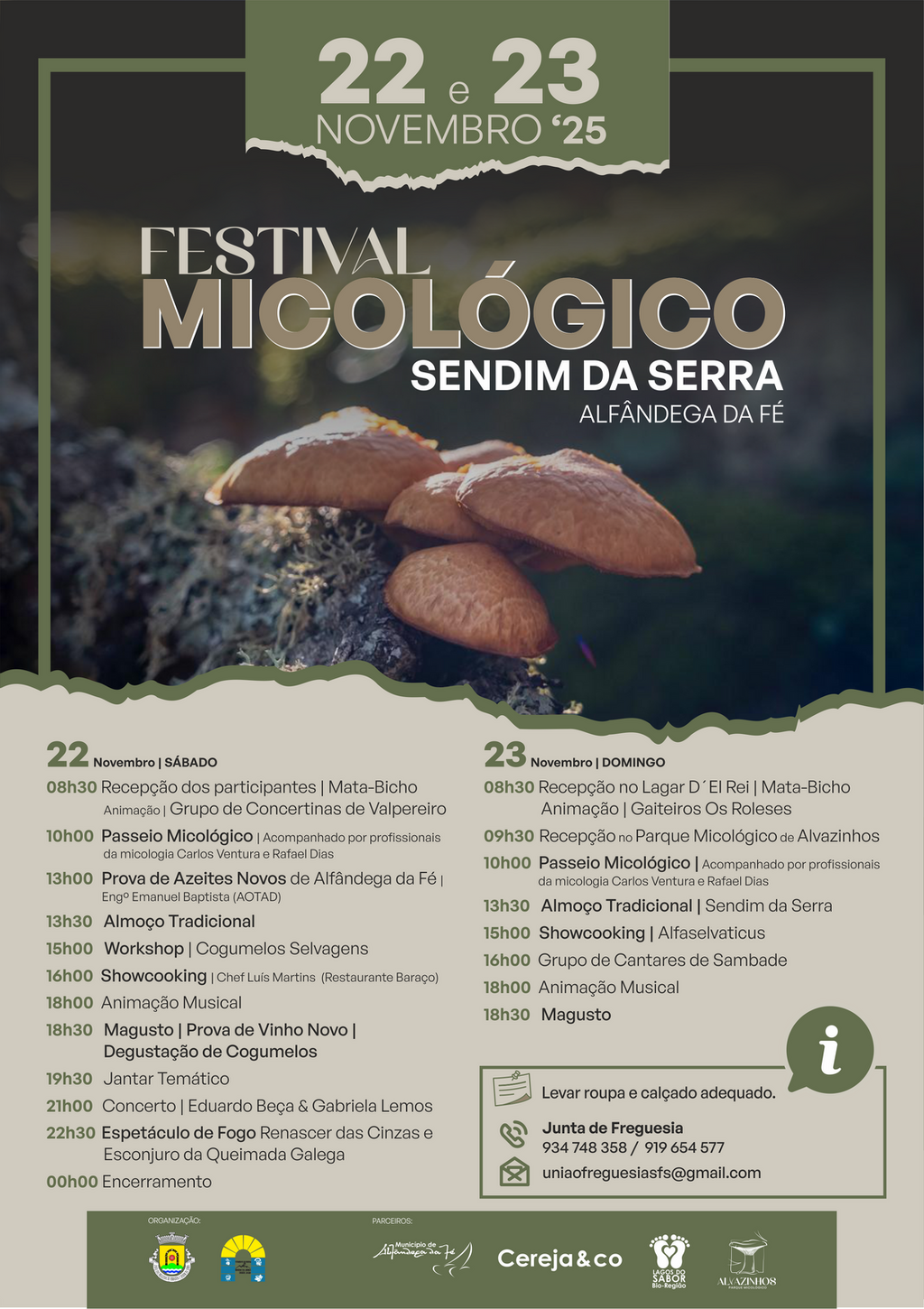 Nos dias 22 e 23 de novembro, a aldeia de Sendim da Serra, no concelho de Alfândega da Fé, recebe o primeiro Festival Micológico, uma iniciativa que pretende celebrar a ligação entre a natureza, a gastronomia e as tradições locais, e que nasce dos Passeios Micológicos realizados nos dois últimos anos e que foram um sucesso. Durante o fim de semana, o ambiente outonal será o cenário perfeito para um encontro marcado pelo convívio, pela descoberta e pelos sabores típicos desta época.