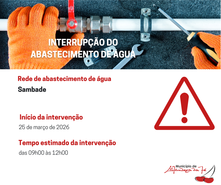 Informa-se que haverá lugar à interrupção do abastecimento de água, na localidade de Sambade, no dia 25 de março de 2026, entre as 09h00 e as 12h00.