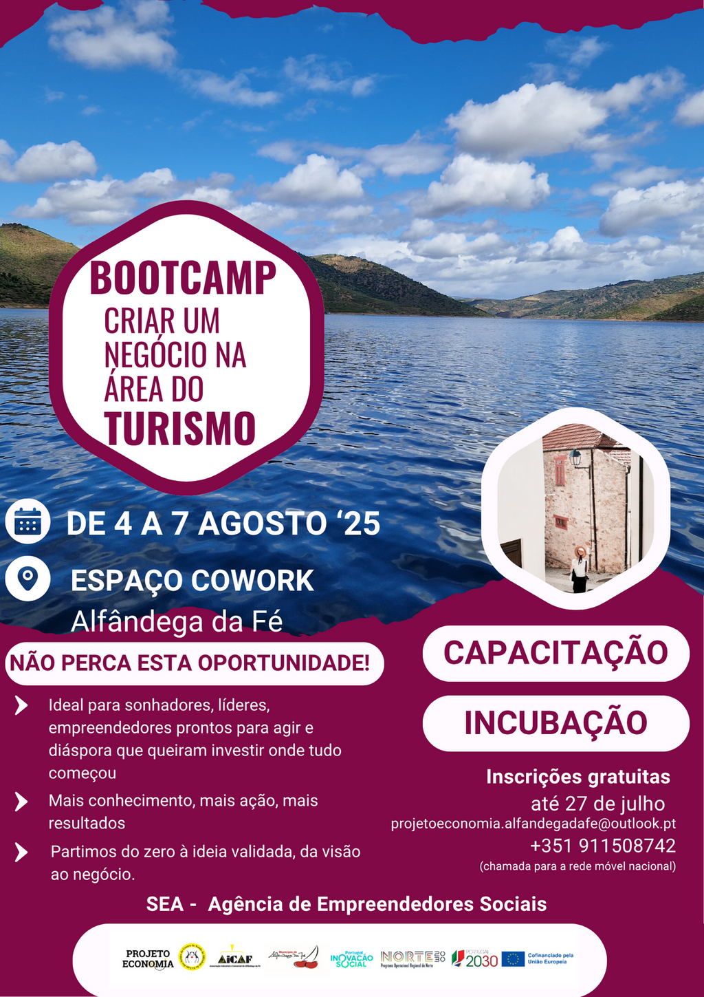 Entre os dias 4 e 7 de agosto, o espaço Cowork de Alfândega da Fé acolhe o Bootcamp “Criar um Negócio na Área do Turismo”, uma iniciativa promovida pelo projeto +Economia, especialmente dirigida a pessoas da diáspora e a empreendedores com interesse no setor do turismo – uma área em crescente desenvolvimento no território.