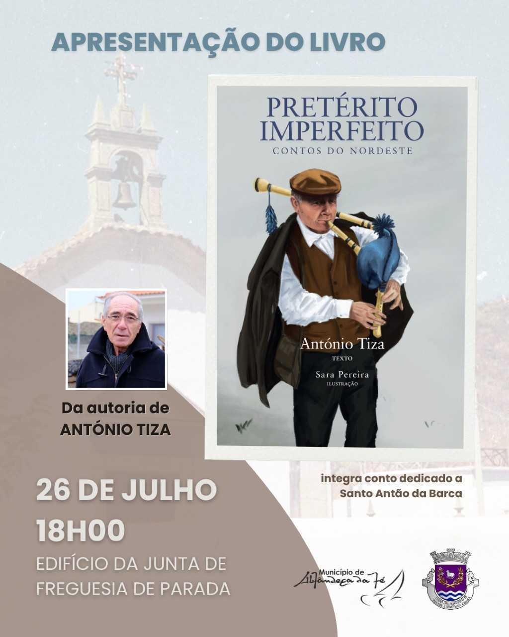 Em dia de Festa de S. Tiago, a aldeia da Parada recebe a apresentação do livro "Pretérito Imperfeito - Contos do Nordeste", do autor António Tiza, às 18h00, no Edifício da Junta de Freguesia.