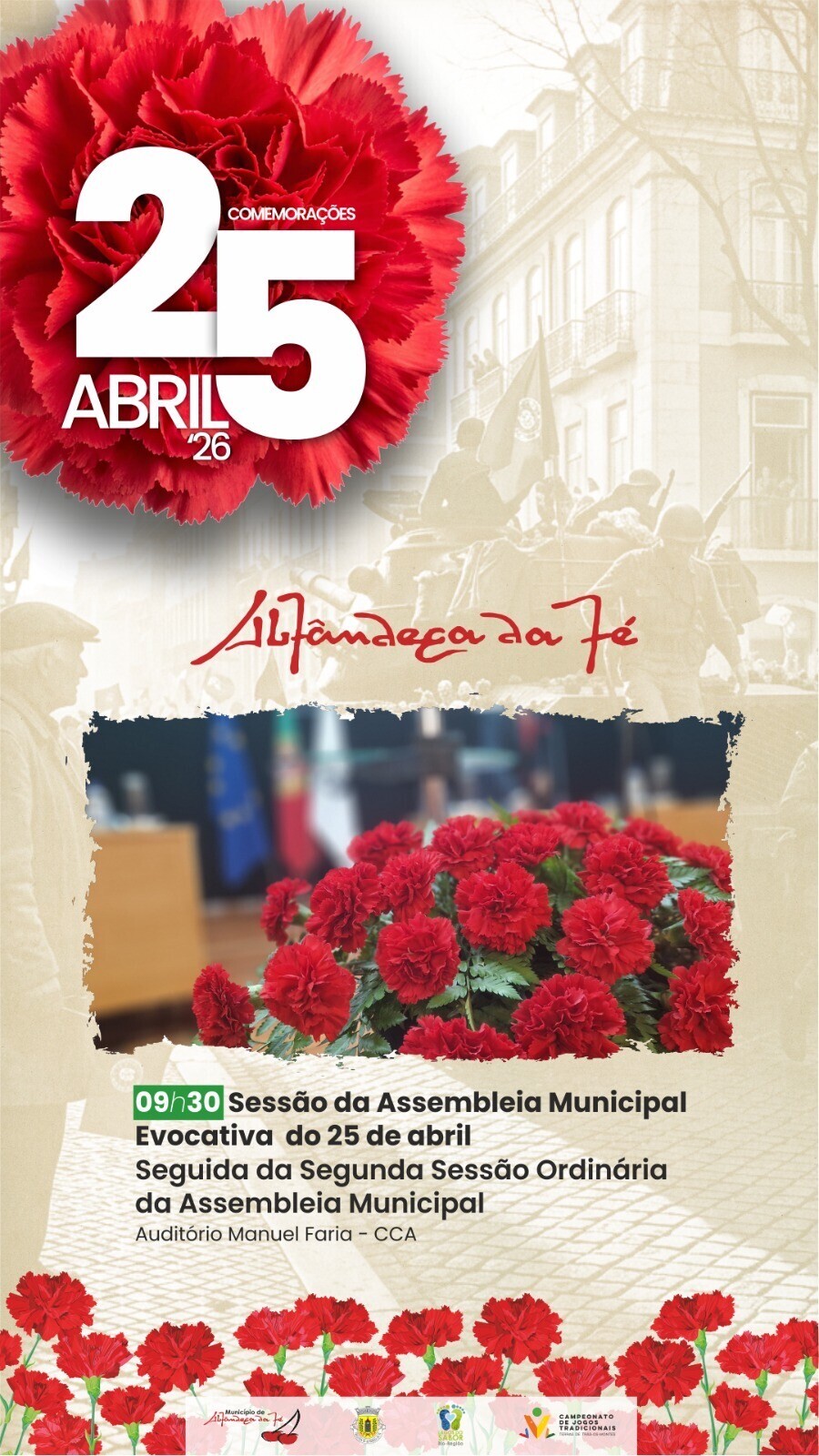 No próximo dia 25 de abril de 2026, realizam-se a Sessão Evocativa do 25 de abril e a 2.ª Sessão Ordinária da Assembleia Municipal do ano de 2026. A sessão tem início às 09h30, no Auditório Manuel Faria, da Casa da Cultura Mestre José Rodrigues, em Alfândega da Fé, e será transmitida em direto na página de Facebook da autarquia.