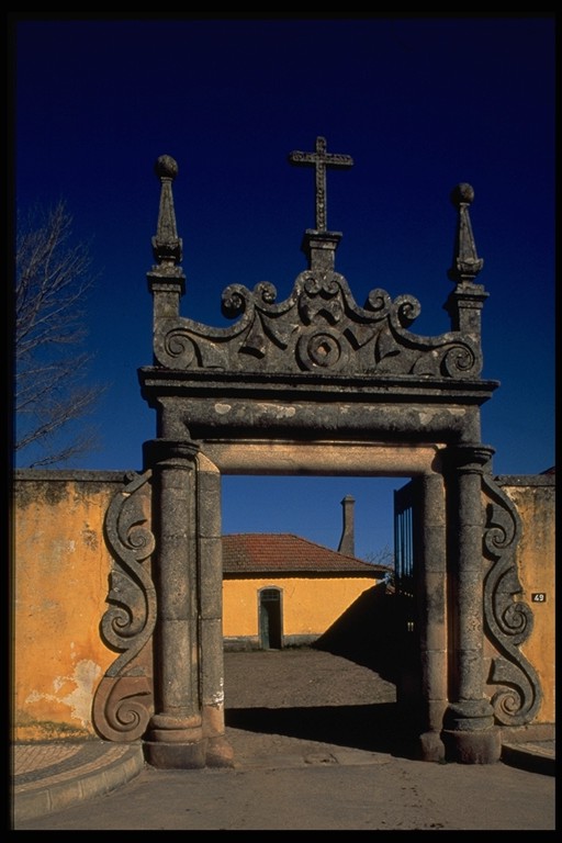Portal granítico maneirista, de vão recto, com ombreiras flanqueadas por duas meias colunas toscanas e encimado por um frontão. Este é ladeado por dois pináculos nas extermidades e por uma cruz latina ao centro e ornado com decoração central de dois círculos concêntricos em alto relevo, com quadrifólio central em baixo relevo. As colunas são emolduradas, da parte exterior, por volutas, motivo que remata igualmente os ângulos do frontão. O interior é austero e desprovido de decoração. Recebeu portão de duas folhas pintado a verde.